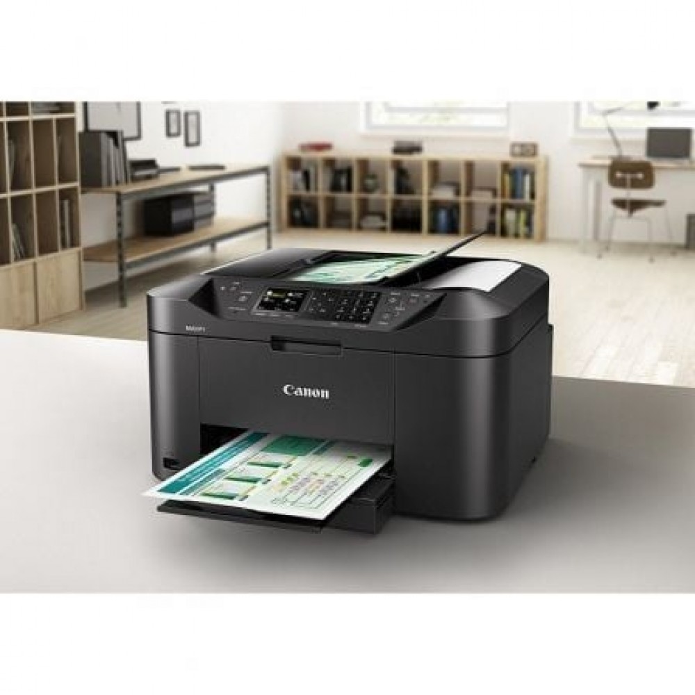 Excelente multifunción de inyección de tinta en color, con impresora, escáner, copiadora y fax , y compatibilidad para impresión y escaneo con dispositivos móviles y servicios en la nube, velocidad de impresión de 19 ipm en blanco y negro, y una amplia gama de funciones de red.. . Especificaciones: . ESPECIFICACIONES DE IMPRESIóN. . Velocidad de impresión (aprox.):. 19,0 ipm en blanco y negro A4¹. 13,0 ipm en color A4¹. Tiempo de salida de la primera página (aprox.):. Blanco y negro: 6 s (preparado) / 10 s (suspensión). Color: 7 s (listo) / 14 s (suspensión). Tecnología de impresión: Inyección de tinta, cabezales FINE. Máxima resolución de impresión: 600 x 1.200 ppp. Márgenes de impresión (mín.): Superior: 3 mm, inferior: 5 mm, izquierda y derecha: 3,4 mm. Impresión a doble cara: Automática (papel normal A4, LTR). ESPECIFICACIONES DE ESCANEO. . Tipo de escáner: Superficie plana, ADF. Tecnología de escáner: Escáner en color CIS. Resolución del escáner (óptica): Hasta 1.200 x 1.200 ppp¹. Tamaño máximo del documento:. Escáner plano: A4, LTR (216 x 297 mm). ADF: A4, LTR, LGL. Profundidad de escaneo (entrada / salida):. Color: 48 bits / 24 bits. Escala de grises: 16 bits / 8 bits. Funciones de escaneo: Escaneo a correo electrónico, escaneo a carpeta de red, escaneo a la nube, escaneo a USB. ESPECIFICACIONES DE COPIA. . Velocidad de copia (aprox.):. ADF color: 10 ipm¹. ADF mono: 18 ipm¹. Copias múltiples: Hasta 99 páginas. Rango de ampliación/reducción: 25-400%, Ajuste a página. Ajustes de calidad de copia: Estándar, Alta. Funciones de copia: Borrar marco, clasificación, 2 en 1, 4 en 1. ESPECIFICACIONES DE FAX. . Tipo de fax: Súper G3 / Color. Resolución del fax:. Blanco y negro: hasta 300 x 300 ppp. Color: 200 x 200 ppp. Velocidad de fax:. Blanco y negro: aprox. 3 segundos (33,6 kbps)¹. Color: aprox. 1 min. (33,6 kbps)¹. Memoria del fax: Hasta 250 páginas. Marcación abreviada codificada: Máx. 100 ubicaciones. Marcación de grupos: Máx. 99 ubicaciones. TINTAS Y RENDIMIENTO. . Tipo de tinta:. Tinta Dual Resistant High Density. 4 depósitos de tinta (negro, cian, magenta, amarillo). Tintas XL:. PGI-1500XL BK (1.200 páginas)¹. PGI-1500XL C (1.020 páginas)¹. PGI-1500XL M (780 páginas)¹. PGI-1500XL Y (935 páginas)¹. Rendimiento medio de los depósitos de tinta de color (CMY): 900 páginas¹. COMPATIBILIDAD DE PAPEL. . Tipos de papel:. Papel normal. Sobres (DL, COM10, C5, Monarca). Papel Canon de Alta Resolución (HR-101N). Canon Mate (MP-101). Canon Pro Luster (LU-101). Canon Plus Semi Brillante (SG-101). Canon Fotográfico Brillo II (PP-201). Canon Brillo ""Uso Diario"" (GP-501). Entrada máxima de papel: Cassette: 250 hojas de papel normal. Tamaños del papel:. Papel normal, A4, A5, B5, LTR, LGL. Papel fotográfico: A4, LTR, 20 x 25 cm, 13 x 18 cm, 10 x 15 cm. Tamaños personalizados: ancho de 89 a 215,9 mm; longitud de 127 a 355,6 mm. Gramaje del papel:. Papel normal: 64 - 105 g/m². Papel fotográfico de Canon de hasta 275 g/m². CONECTIVIDAD. . Conexiones con cable:. Hi-Speed USB 2.0. Puerto para memoria flash USB (tipo A). Conexiones inalámbricas:. Wi-Fi IEEE802.11 b/g/n¹. Banda de frecuencia de LAN inalámbrica: 2,4 GHz. Modo punto de acceso. Compatibilidad de aplicaciones:. Aplicación Canon PRINT Inkjet/SELPHY. MAXIFY Cloud Link (desde la pantalla de la impresora o dispositivo inteligente). Plug-in Canon Print Service (Android). Mopria. Impresión móvil de Microsoft. Apple AirPrint. Google Cloud Print. . . CARACTERíSTICAS GENERALES. . Tipo y tamaño de pantalla: Pantalla en color de 6,2 cm. Alimentador automático de documentos: Hasta 50 hojas. Dimensiones (An x Pr x Al):. 463 x 389 x 260 mm. 463 x 459 x 260 mm (papel instalado). Peso: 10,6kg. Fuente de alimentación: CA 100-240 V, 50/60 Hz. Consumo de energía: . Standby (lámpara del escáner apagada). Conexión USB a PC: aprox. 0,9 7. APAGADO: aprox. 0,2 W. Copia (conexión USB a PC): aprox. 27 W¹. Consumo eléctrico típico: 0,2 kWh¹. Niveles de ruido: Aprox. 56 dB(A)¹. Entorno operativo recomendado: . Temperatura: 15-30 ºC. Humedad: 10 - 80% HR (sin condensación). Rendimiento (mensual): hasta 20.000 páginas¹. Volumen de impresión recomendado: 200-1.000 páginas/mes