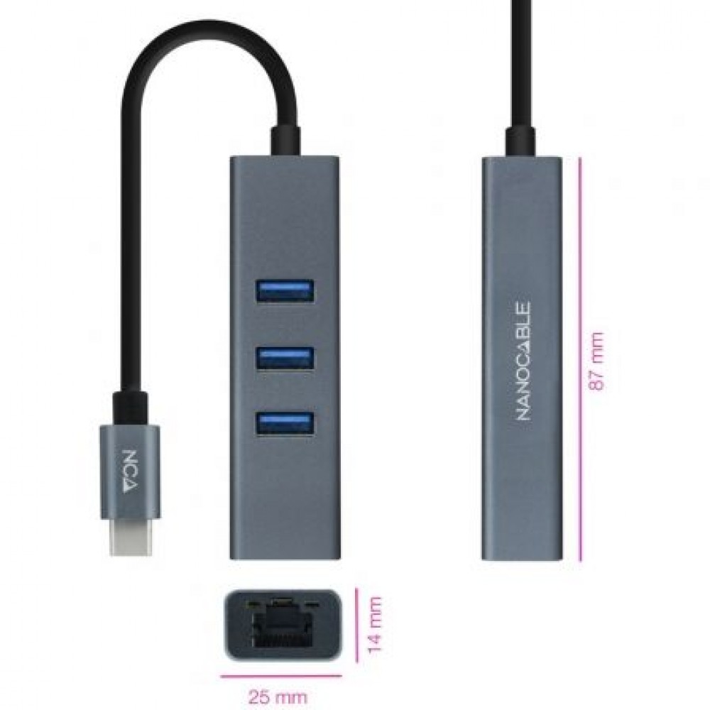 Especificación:. . Permite conectar a una salida USB-C una conexión de red por cable Gigabit, además de disponer de 3 conexiones tipo USB 3.0*. Incluye led de funcionamiento y de actividad. No requiere software ni controladores, una solución totalmente plug and play. Compatible con USB 2.0. Compatible con Windows (7/8/8.1/10), Mac OS X, Linux OS**. Compatible con IEEE 802.3, 802.3u and 802.3ab. * La corriente total de las 3 salidas de USB 3.0 depende de la corriente de salida del USB-C del dispositivo al que se conecte. . ** Se requiere drivers para algunos sistemas operativos.. Longitud: 15 cm . Material: Aluminio. Color: Gris. Normativas: RoHS. Test de funcionamiento: 100% testado