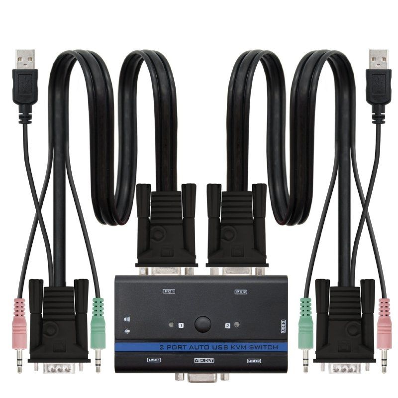 Este KVM switch es un dispositivo que puede controlar dos ordenadores con un solo teclado, ratón, monitor y altavoces