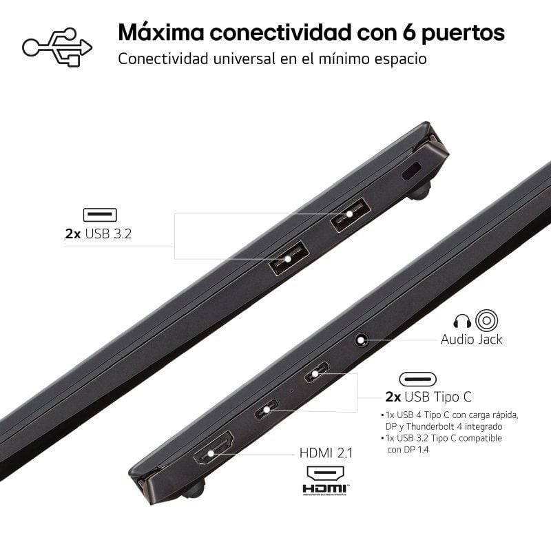 Alta conectividad con diversos tipos de puertos y Bluetooth., que permiten mayor usabilidad y alta velocidad de transferencia de datos y compatibilidad en el tiempo con diversos periféricos. El LG gram es uno de los portátiles más silenciosos y eficientes térmicamente del mercado, gracias a la optimización del sistema de ventilación, que permite mover un 50% más de caudal de aire que generaciones anteriores, con un nivel de ruido de solo 25dB