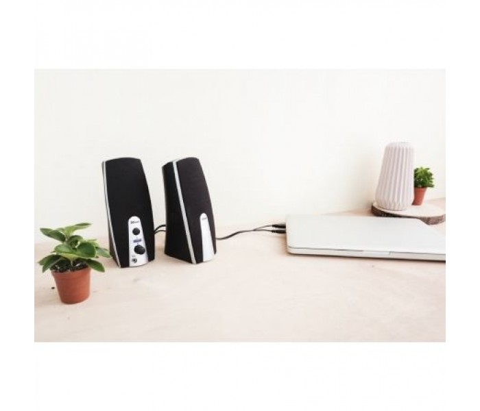 - Compacto juego de altavoces estéreo con potencia de salida RMS de 5 Vatios (máx. potencia: 10 vatios)