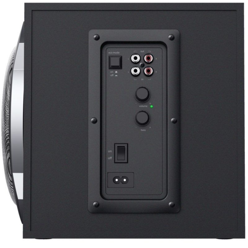 Juego de altavoces 2.1 con altavoz de subgraves en madera y una potencia total de salida RMS de 60 Vatios (máx. potencia: 120 vatios). Sonido de gran calidad con subgraves más profundos. Cómodo mando cableado para un fácil control del volumen con auriculares y conectores para iPod/mp3. Botones para controlar el volumen y los sonidos graves en el lateral. Inteligente administración de la alimentación: se establece en reposo si no está en uso.