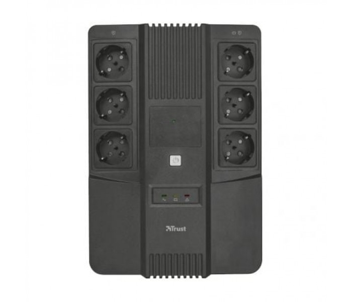 - 3 tomas de corriente para batería y protegidas contra sobretensiones y 3 tomas de corriente de pared protegidas contra sobretensiones para conectar el ordenador, periféricos informáticos, equipos de redes, TV de pantalla plana, productos de domótica o sistemas de alarma