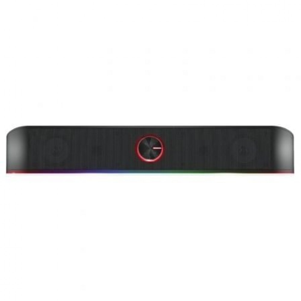 Barra de sonido estéreo con iluminación RGB y un diseño que ahorra espacio.