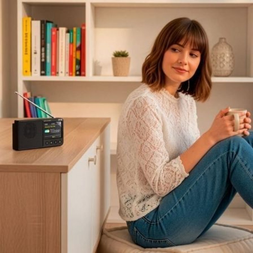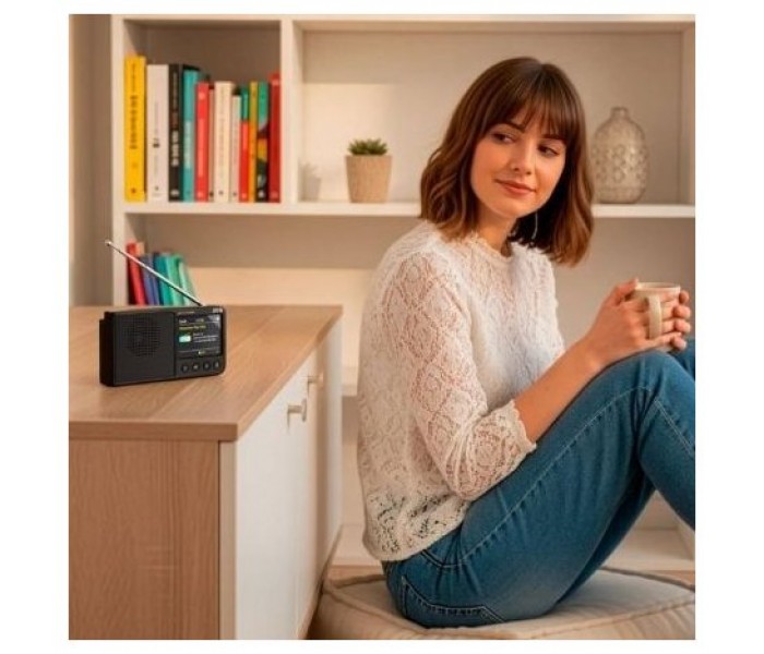 Radio digital DAB+ y FM con amplia pantalla TFT de 2,4” a color, con DAB+ y FM RDS (Radio Data System) para ver en ella la emisora, la hora, las funciones activas y más. 80 presintonías, sintonización fácil, batería recargable con hasta 7h de autonomía, función despertador y altavoz bluetooth de 2W.