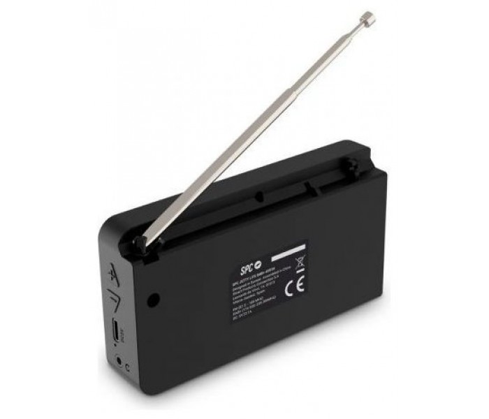Radio Portátil SPC Valdi/ Negra Marca SPC Modelo 4590N Características Alimentación - Alimentación AC: 230V~50Hz. - Rango de frecuencias: FM (87.5-108 MHz) AM (522-1620 kHz). - Entrada auxiliar tipo Jack de 3.5mm. - Potencia de salida: 0.8W RMS. - Impedancia: 8 Ohm..