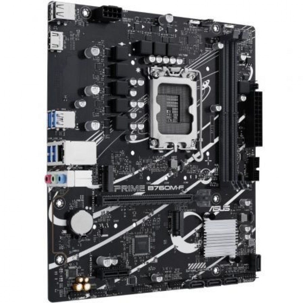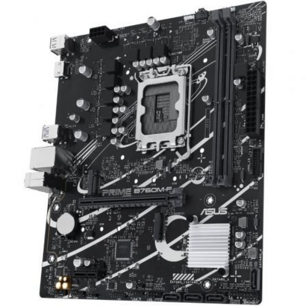 ASUS PRIME B760M-F, una placa base micro-ATX Intel® B760 LGA 1700 con PCIe 4.0, dos ranuras PCIe 4.0 M.2, DDR5, Ethernet Realtek de 1 Gb, HDMI™, SATA 6 Gbps, puertos USB frontales de 5 Gbps y Aura Sync.