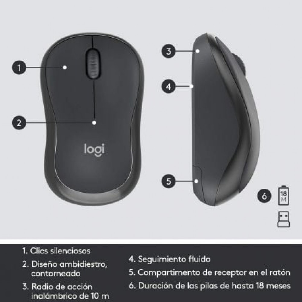 Forma contorneada y portátil. Suavidad y precisión al hacer clic y señalar en la mayoría de superficies. Sin olvidar la tranquilidad posibilitada por SilentTouch.TECNOLOGÍA INALÁMBRICA SIN DEMORAS