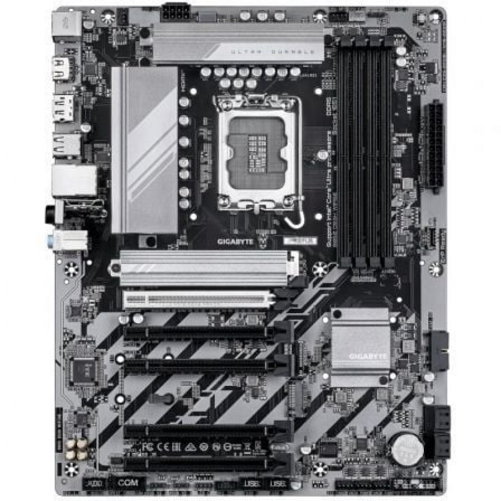 CPU. . LGA1851 socket: Support for Intel® Core™ Ultra Processors. (Go to GIGABYTE"s website for the latest CPU support list.). L3 cache varies with CPU. . Chipset. . Intel® B860 Express Chipset. . Memory. . Support for DDR5 9066(O.C)/8800(O.C) /8600(O.C) / 8400(O.C) /8266(O.C) / 8200(O.C) / 8000(O.C) / 7950(O.C) / 7900(O.C) / 7800(O.C) / 7600(O.C.) / 7400(O.C.) / 7200(O.C.) / 7000(O.C.) / 6800(O.C.) / 6600(O.C.) / 6400 / 5600 MT/s memory modules. 4 x DDR5 DIMM sockets supporting up to 256 GB (64 GB single DIMM capacity) of system memory. Dual channel memory architecture. Support for ECC Un-buffered DIMM 1Rx8/2Rx8 memory modules (operate in non-ECC mode). Support for non-ECC Un-buffered DIMM 1Rx8/2Rx8/1Rx16 memory modules. Support for Extreme Memory Profile (XMP) memory modules. (The CPU and memory configuration may affect the supported memory types, data rate (speed), and number of DRAM modules, please refer to ""Memory Support List"" on GIGABYTE"s website for more information.). . Onboard Graphics. . Integrated Graphics Processor-Intel® HD Graphics support:. - 1 x HDMI port, supporting a maximum resolution of 4096x2160@60 Hz. * Support for HDMI 2.1 version and HDCP 2.3.. - 1 x DisplayPort, supporting a maximum resolution of 3840x2160@144 Hz. * Support for DisplayPort 2.1 version.. (Graphics specifications may vary depending on CPU support.). . Audio. . Realtek® Audio CODEC. High Definition Audio. 2/4/5.1/7.1-channel. . * You can change the functionality of an audio jack using the audio software. To configure 7.1-channel audio, access the audio software for audio settings.. . Support for S/PDIF Out. . LAN. . Realtek® 2.5GbE LAN chip (2.5 Gbps/1 Gbps/100 Mbps). . Wireless Communication module. . Intel® Wi-Fi 6E AX211 (PCB rev. 1.0). - WIFI a, b, g, n, ac, ax, supporting 2.4/5/6 GHz carrier frequency bands. - BLUETOOTH 5.3. - Support for 11ax 160MHz wireless standard. Realtek® Wi-Fi 6E RTL8852CE (PCB rev. 1.1). - WIFI a, b, g, n, ac, ax, supporting 2.4/5/6 GHz carrier frequency bands. - BLUETOOTH 5.3. - Support for 11ax 160MHz wireless standard. (Actual data rate may vary depending on environment and equipment.). . Expansion Slots. . CPU:. - 1 x PCI Express x16 slot, supporting PCIe 5.0 and running at x16 (PCIEX16). * The PCIEX16 slot can only support a graphics card or an NVMe SSD. If only one graphics card is to be installed, be sure to install it in the PCIEX16 slot.. Chipset:. - 4 x PCI Express x16 slots, supporting PCIe 4.0 and running at x1 (PCIEX1_1~PCIEX1_4). . Storage Interface. . CPU:. - 1 x M.2 connector (Socket 3, M key, type 25110/22110/2580/2280 PCIe 5.0 x4/x2 SSD support) (M2A_CPU). Chipset:. - 1 x M.2 connector (Socket 3, M key, type 25110/22110/2580/2280 PCIe 4.0 x4/x2 SSD support) (M2P_SB). - 4 x SATA 6Gb/s connectors. RAID 0, RAID 1, RAID 5, and RAID 10 support for SATA storage devices. . USB. . Chipset:. - 1 x USB Type-C® port on the back panel, with USB 3.2 Gen 2x2 support. - 1 x USB Type-C® port with USB 3.2 Gen 1 support, available through the internal USB header. - 1 x USB 3.2 Gen 2 Type-A port (red) on the back panel. - 2 x USB 3.2 Gen 1 ports available through the internal USB header. - 4 x USB 2.0/1.1 ports on the back panel. Chipset+USB 2.0 Hub:. - 4 x USB 2.0/1.1 ports available through the internal USB headers. . Internal I/O Connectors. . 1 x 24-pin ATX main power connector. 1 x 8-pin ATX 12V power connector. 1 x CPU fan header. 1 x CPU fan/water cooling pump header. 2 x system fan headers. 2 x system fan/water cooling pump headers. 3 x addressable RGB Gen2 LED strip headers. 1 x RGB LED strip header. 2 x M.2 Socket 3 connectors. 4 x SATA 6Gb/s connectors. 1 x front panel header. 1 x front panel audio header. 1 x S/PDIF Out header. 1 x USB Type-C® header, with USB 3.2 Gen 1 support. 1 x USB 3.2 Gen 1 header. 2 x USB 2.0/1.1 headers. 1 x Trusted Platform Module header (For the GC-TPM2.0 SPI/GC-TPM2.0 SPI 2.0/GC-TPM2.0 SPI V2 module only). 1 x serial port header. 1 x Q-Flash Plus button. 1 x reset jumper. 1 x Clear CMOS jumper. . Back Panel Connectors. . 1 x PS/2 keyboard/mouse port. 1 x HDMI port*. 1 x DisplayPort*. 1 x USB Type-C® port, with USB 3.2 Gen 2x2 support. 1 x USB 3.2 Gen 2 Type-A port (red). 4 x USB 2.0/1.1 ports. 1 x RJ-45 port. 2 x antenna connectors (2T2R). 3 x audio jacks. . * Actual support may vary by CPU.. . I/O Controller. . iTE® I/O Controller Chip. . BIOS. . 1 x 256 Mbit flash. Use of licensed AMI UEFI BIOS. PnP 1.0a, DMI 2.7, WfM 2.0, SM BIOS 2.7, ACPI 5.0. . Form Factor. . ATX Form Factor; 30.5cm x 24.4cm