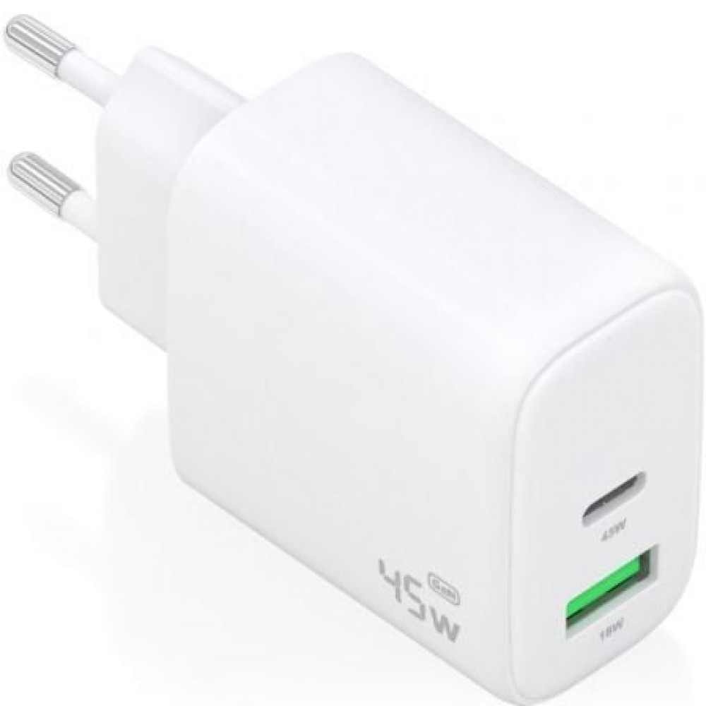 A110-0971 – Cargador GaN 45W, 1xUSB-C PD3.0 QC4.0, 1xUSB-A QC3.0, Blanco