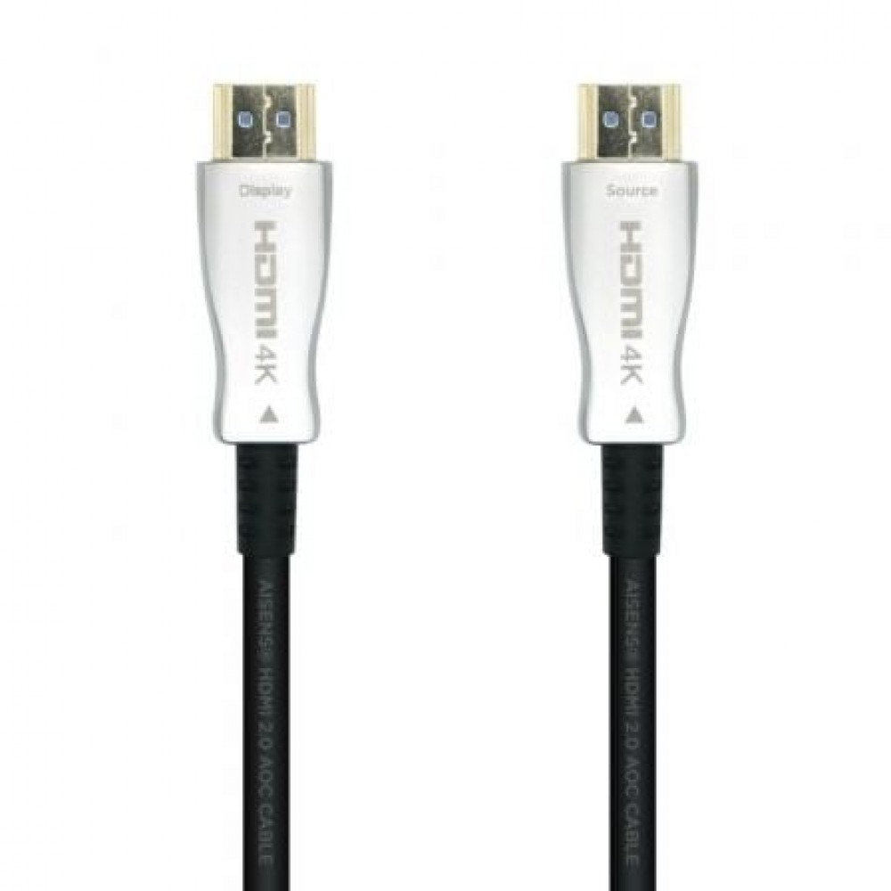 Cable HDMI V2.0 AOC premium alta velocidad con Ethernet con conector tipo A macho en ambos extremos.Fabricado con una mezcla de alambre de fibra óptica y cobre, este cable activo es menos sensible a interferencias EMI, lo cual ofrece una señal clara y fiable de audio/vídeo, incluso en entornos como centros de datos, hospitales, etc.Conectores de alta calidad blindados en oro de 24K. Múltiple apantallamiento para la máxima reducción de posibles interferencias. Fabricado con conductores de cobre (cobre OFC-Oxygen Free Copper- 99,99%) de alta calidad que garantiza la máxima calidad de transmisión.Retrocompatible con las especificaciones HDMI anteriores y funciona con todos sus dispositivos HDMI existentes.