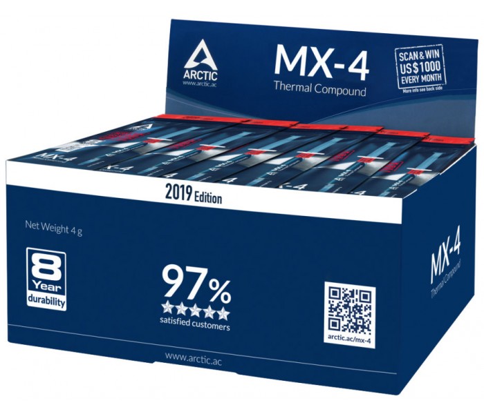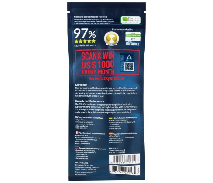ARCTIC MX-4 está disponible en tamaños de 2 a 45 gramos. Su envase resellable evita que la pasta se seque.