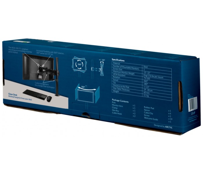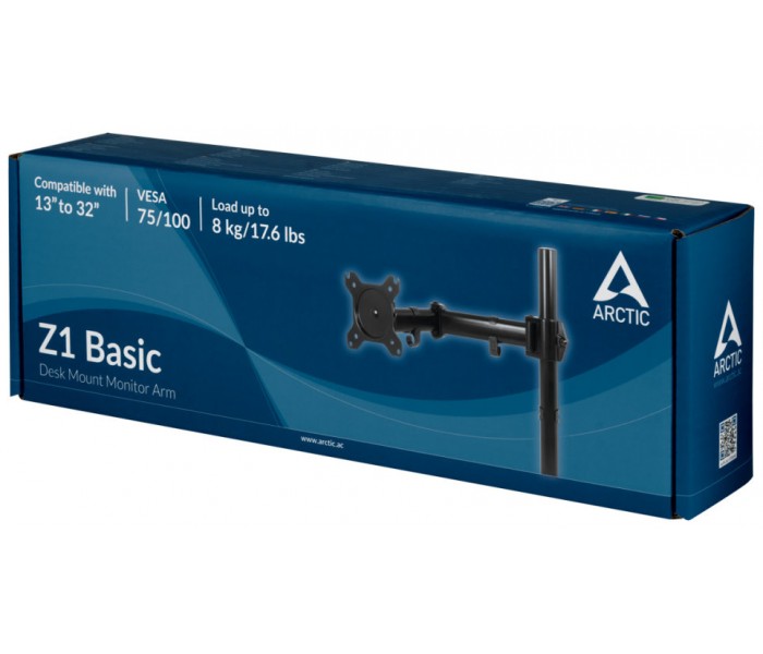 ARCTIC Z1 Basic. Montaje: Abrazadera, Adecuado para: Monitor de ordenador, Capacidad máxima de peso: 8 kg, Tamaño mínimo de pantalla: 33 cm (13"), Tamaño máximo de pantalla: 81,3 cm (32"), Compatibilidad con interfaz de montaje (min): 75 x 75 mm, Compatibilidad con interfaz de montaje (max): 100 x 100 mm. Ángulo de inclinación: -15 - 15°. Color del producto: Negro