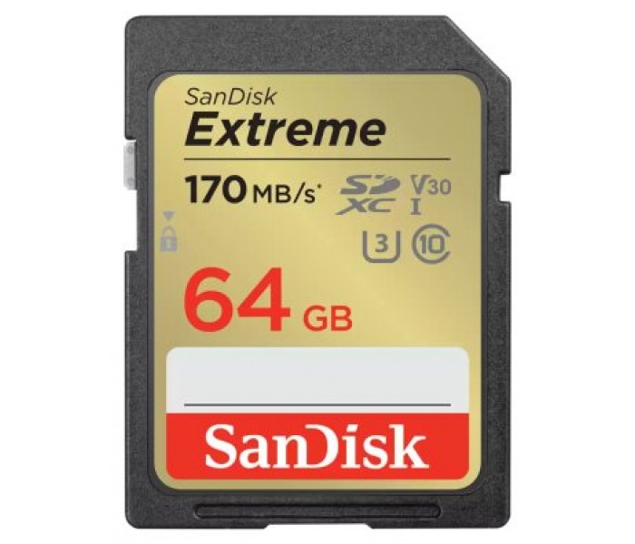 SanDisk Extreme. Capacidad: 64 GB, Tipo de tarjeta flash: SDXC, Clase de memoria flash: Clase 10, Tipo de memoria interna: UHS-I, Velocidad de lectura: 170 MB/s, Velocidad de escritura: 80 MB/s, Clase de velocidad UHS: Class 3 (U3), Clase de velocidad de vídeo: V30. Funciones de protección: Resistente a golpes, Resistente a la temperatura, Resistente al agua, A prueba de rayos X, Color del producto: Negro, Oro