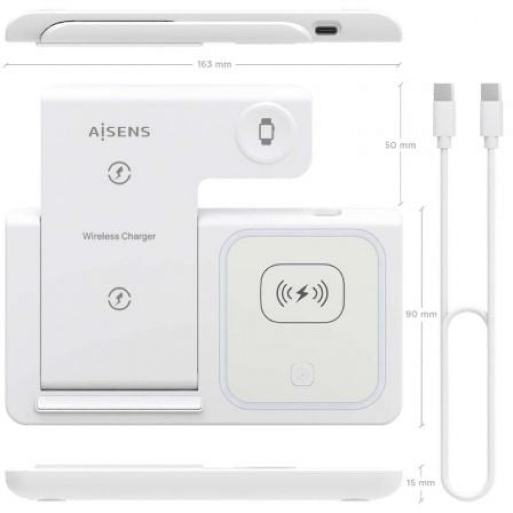 AISENS - CARGADOR INALAMBRICO USB-C 3 EN 1 DE 15W PARA MOVIL, APPLE WATCH, ARICULARES CON ESTUCHE DE CARGA, BLANCO