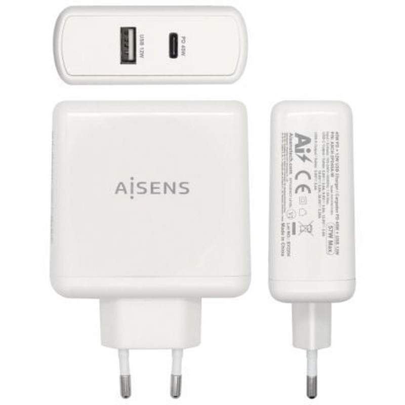 AISENS - CARGADOR 57W, 1xUSB-C PD3.0 45W, 1xUSB-A 5V/2.4A 12W, Blanco