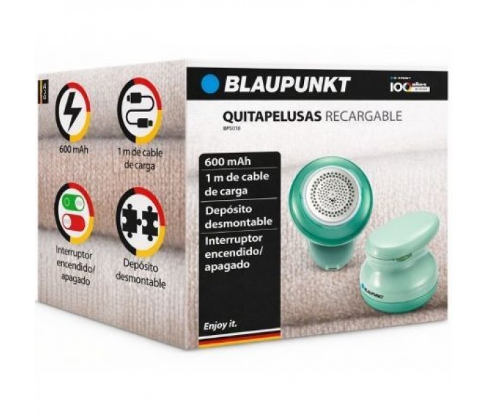 Blaupunkt BP5018 es un quitapelusas recargable para ropa y tapiceríascon depósito desmontable, tapa protectora, interruptor ON/OFF ypuerto de carga USB. Funciona con batería Ni-MH de 2,4 V (2×600mAh) e incluye cable de carga de 1 m para un uso cómodo y continuoen el hogar.