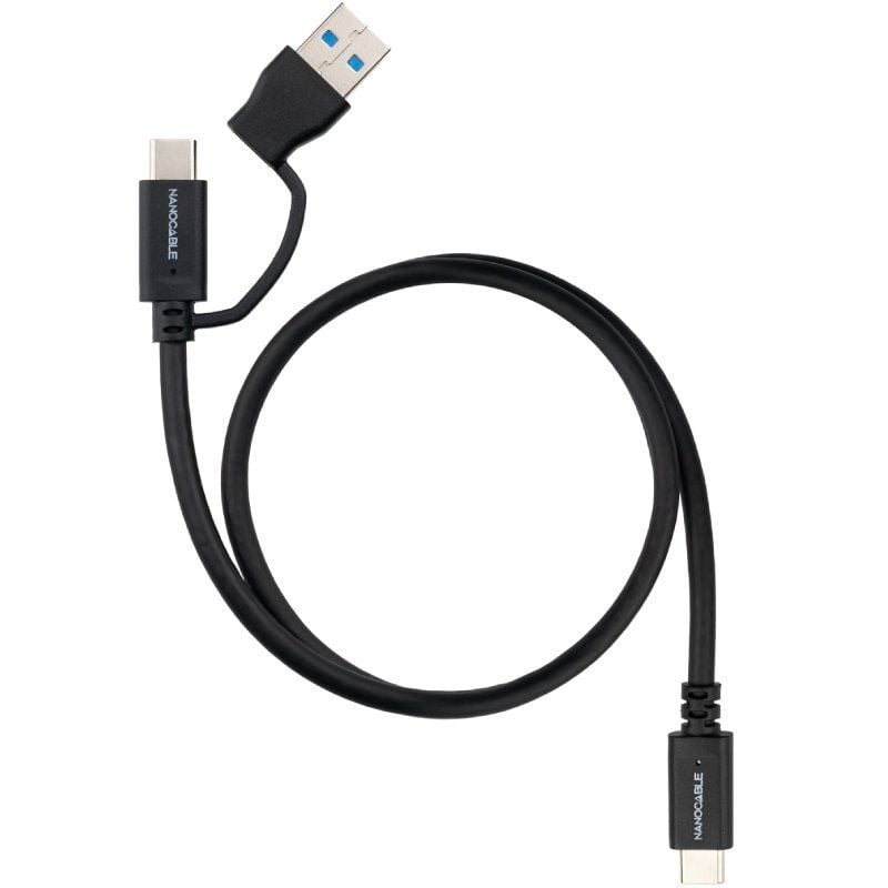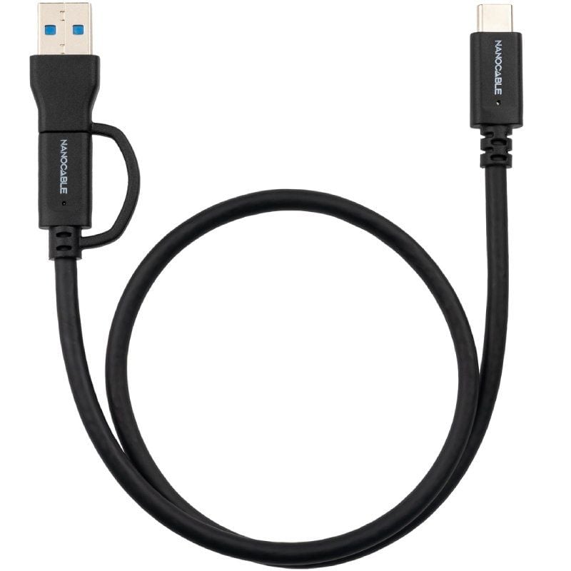 Cable USB-C 3.2 Gen2 10Gbp 60W con conector tipo USB-C/USB-A macho en un extremo y USB-C macho en el otro.