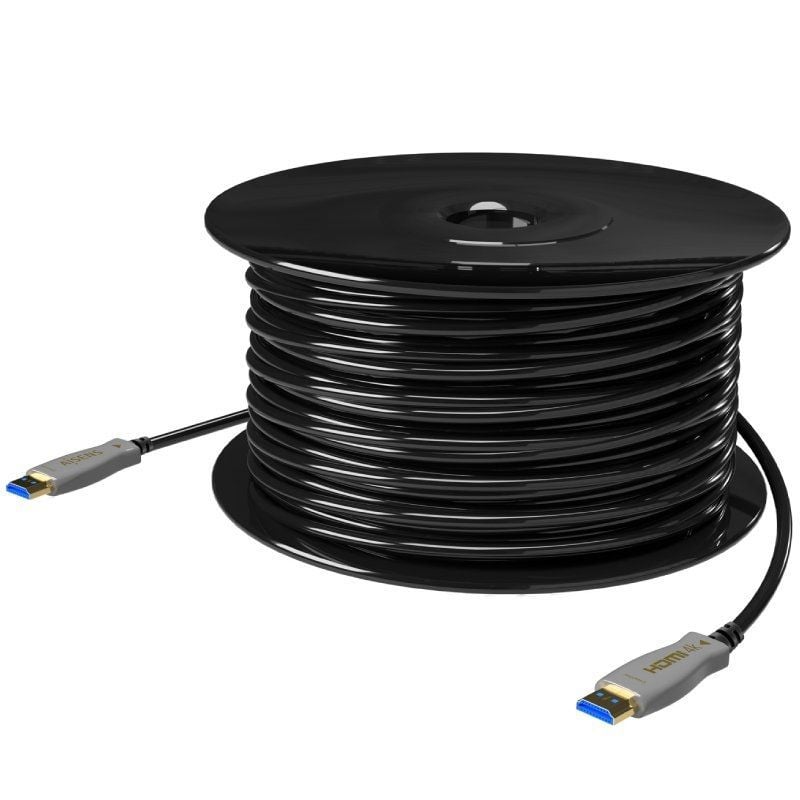 - Fabricado con una mezcla de alambre de fibra óptica y cobre, este cable activo es menos sensible a interferencias EMI, lo cual ofrece una señal clara y fiable de audio/vídeo, incluso en entornos como centros de datos, hospitales