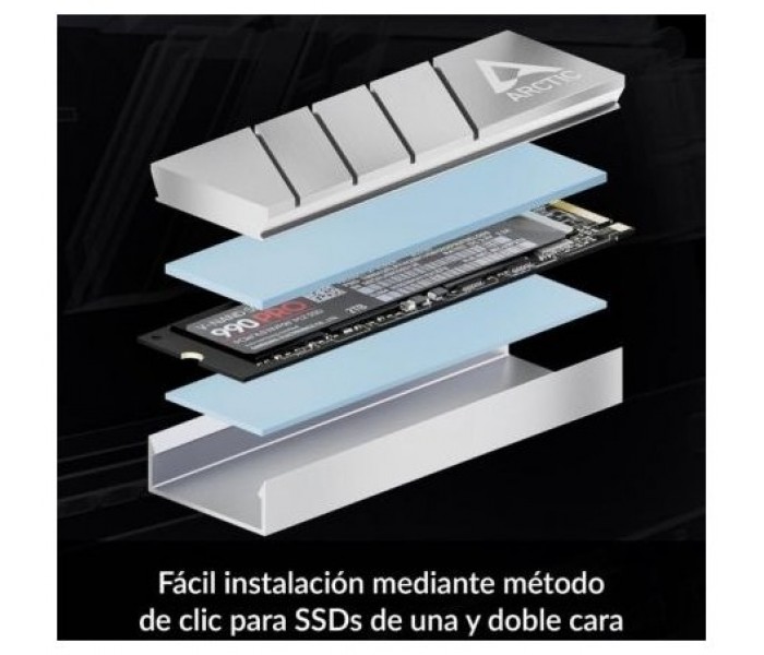 El montaje del ARCTIC M2 Pro no requiere tornillos ni gomas elásticas. En su lugar, el SSD se coloca entre los disipadores mediante un sistema de clic. El disipador NVMe para SSD está diseñado para SSD M.2 2280 de una y dos caras. Las diferencias de altura se compensan con la almohadilla térmica incluida.