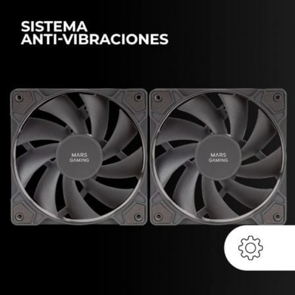 Ventilador con Disipador Mars Gaming MCPU-LCD/ 12cmVentilador. . Tamaño: 120 x 25 mm. Velocidad: 800-2600 RPM ±10%. Flujo de aire: 30-74 CFM. Presión estática: 0,85-1,42 mm-H‚O. Nivel de ruido: 9-28 dBA. Rodamiento: Hidráulico. Vida útil: 60.000 h. Iluminación: ARGB. . Especificaciones. . TDP: 300 W..