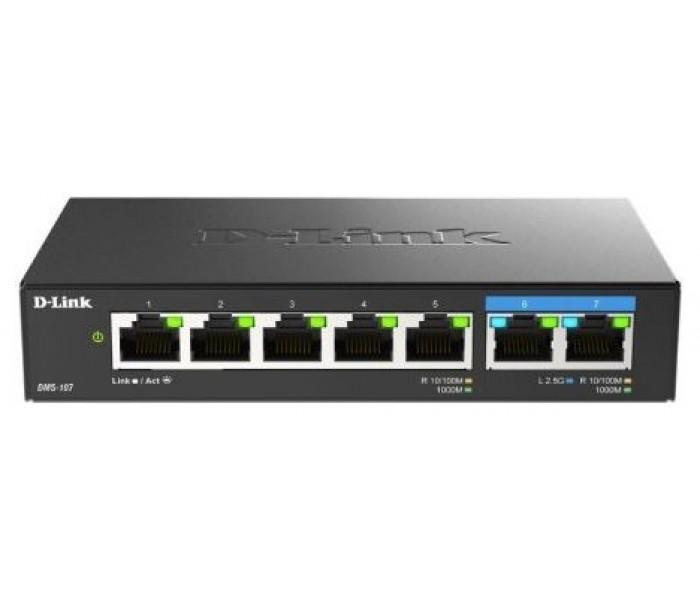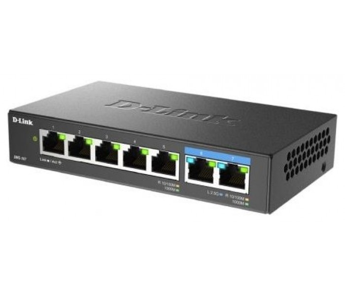 DMS-107 es un switch Ethernet Multi-Gigabit sin gestión que proporciona conexiones a 2.500 Mbps, un nuevo estándar cada vez más presente en servidores NAS, estaciones de trabajo y ordenadores gaming. Puede conectar fácilmente varios dispositivos ampliando los puertos LAN de su router o usarlo como switch de extremo de red, con la flexibilidad de contar con 5 puertos Gigabit y 2 puertos 2.5 Gigabit