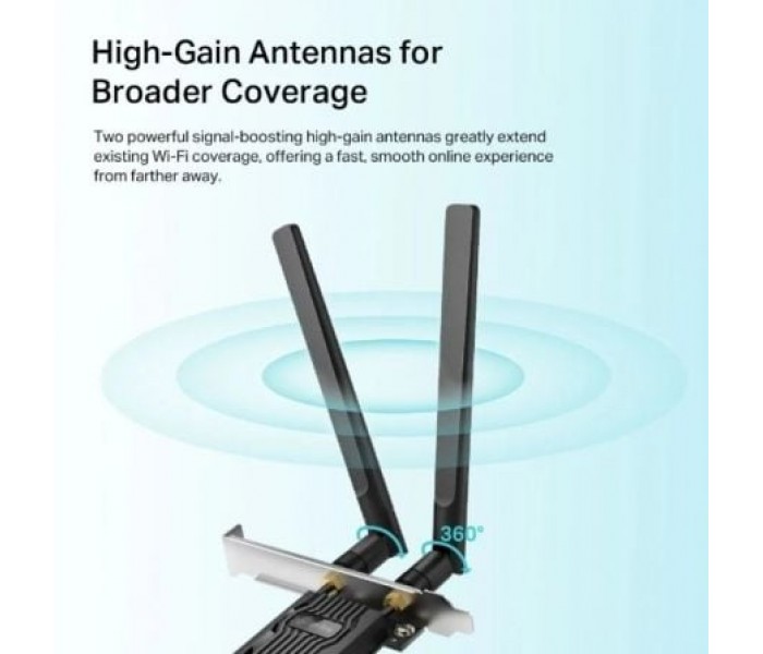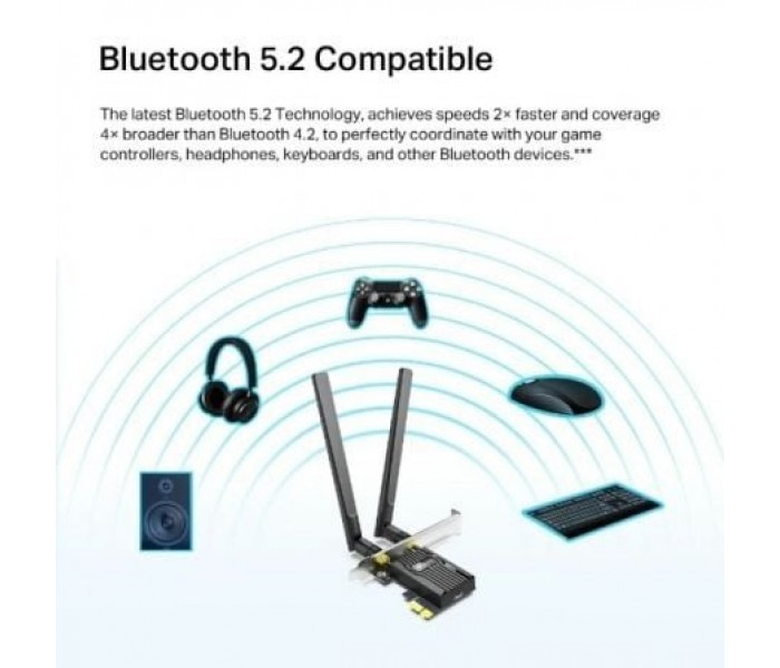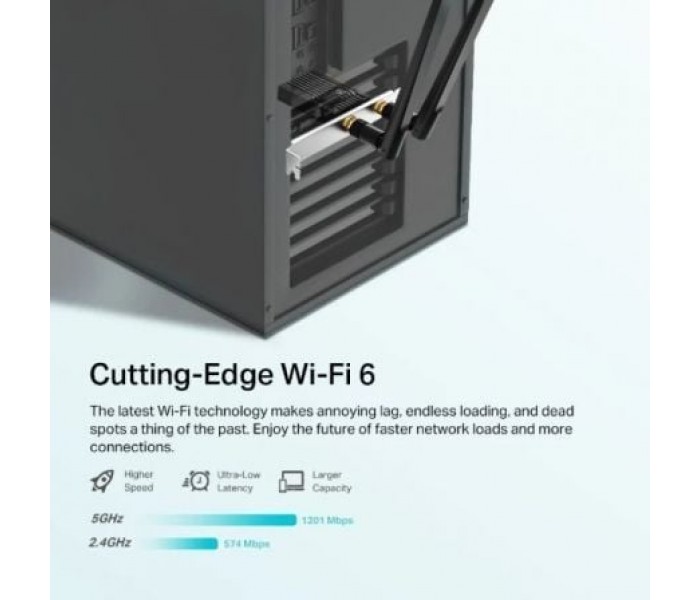 TP-LINK AX1800 DUAL BAND WI-FI 6 BLUETOOTH 5.2 PCI EXPRESS ADAPTER SPEED: 1201 MBPS AT 5 GHZ + 574 MBPS AT 2.4 GHZ SPEC: 2× HIGH GAIN EXTERNAL ANTENNAS FEATURE: MU-MIMO, OFDMA, WPA3, BLUETOOTH 5.2