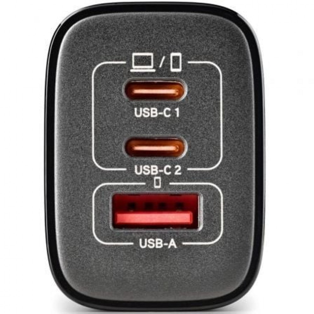 - Cargador GaN de pared con 2 salidas USB-C (PD & PPS) y una salida USB-A QC 3.0 de 65W de potencia máxima para cargar dispositivos de manera rápida y eficiente.