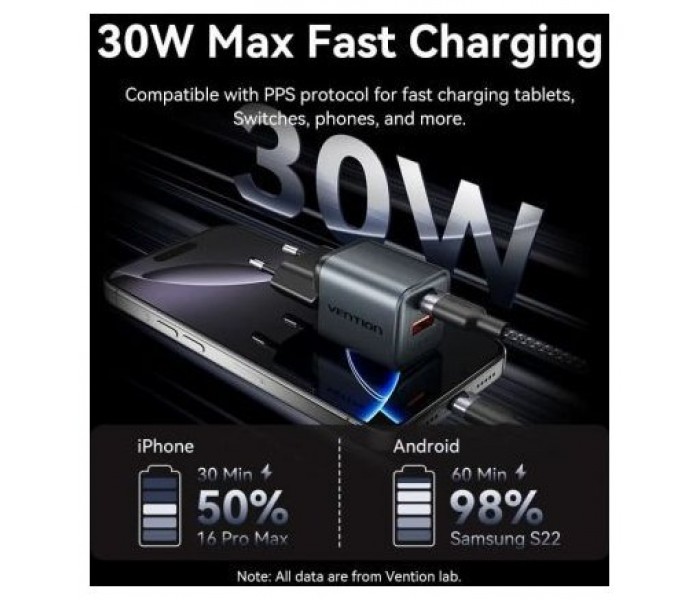 Vention Cargador GaN de 2 puertos USB (C+A) (30 W/18 W) con enchufe UE
