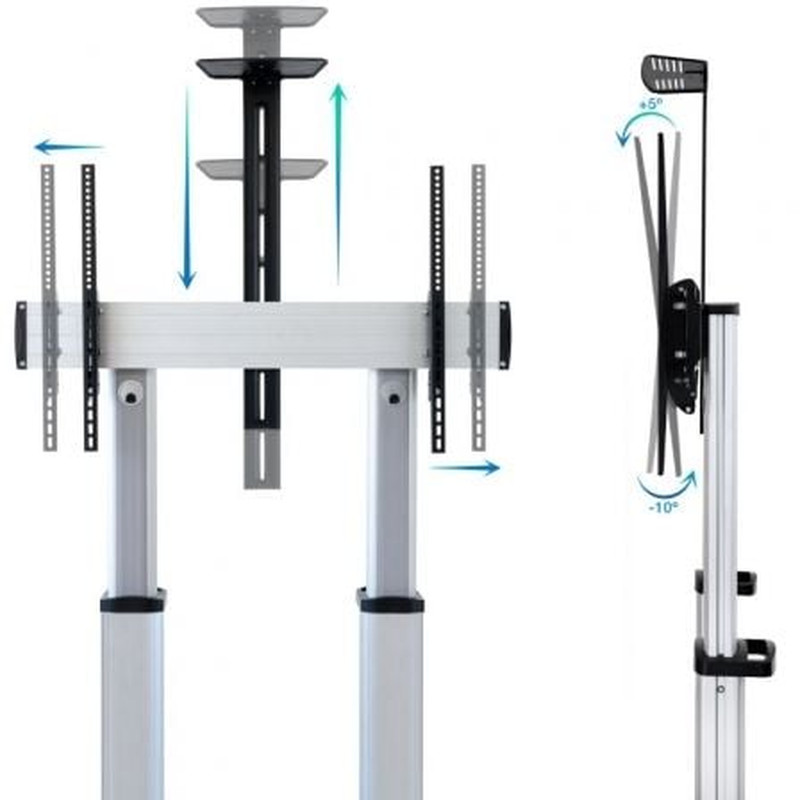 Especificaciones:. . Pantallas soportadas: 60""-100"". Compatible con VESA: Máximo 1000x600. Mínimo 200x200. Peso máximo soportado de pantalla: 100 kg. ángulo de inclinación: +5º/-10º. Bandeja inferior para reproductor/DVD y bandeja superior regulable para webcam. Rango de ajuste de altura del soporte: 1200-1650 mm. Altura máxima con bandeja superior: 2366 mm. Medida de bandejas: Inferior 430x335 mm Superior 285x150 mm. Distancia entre ruedas: 1138x700 mm. Ruedas con sistema de bloqueo. Sistema de organización de cables. Color: Plata. Peso neto: 30 kg. Peso bruto: 33,40 kg. Medidas del embalaje: 1206x655x250 mm