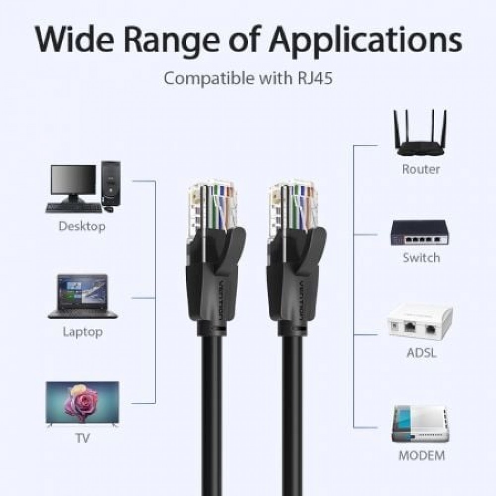 Cable de Red RJ45 UTP Vention IBEBL Cat.6/ 10m/ NegroVention Cat 6 UTP 10 Meters 1000MbpsCable de red con una velocidad máxima de transmisión de 1000Mbps. El cable está blindado con una resistente carcasa de PVC. Ambos extremos tienen un conector macho RJ45 chapado en oroCable Ethernet Cat.6 de 1000..