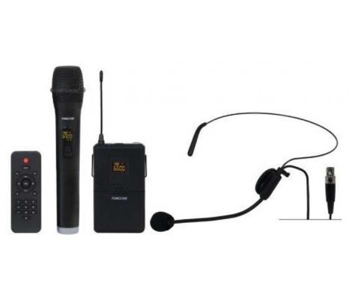 - 2 micrófonos inalámbricos UHF, 1 de mano y 1 de cabeza (650 MHz y 660 MHz).