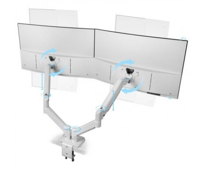 Cada brazo ofrece una gama completa de inclinación, giro y rotación, para adaptar los monitores a cualquier situación. Cambia en segundos entre orientación horizontal y vertical, combina vistas simétricas o descentradas, y optimiza tu flujo de trabajo con total libertad.