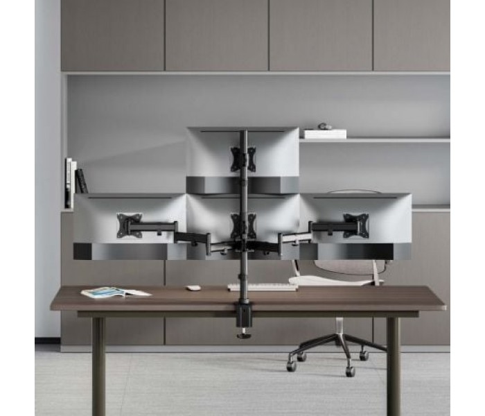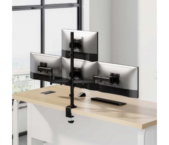 - Soporte de mesa eco giratorio e inclinable para 4 monitores (4 pivotes, 2 brazos) de 13”-27”