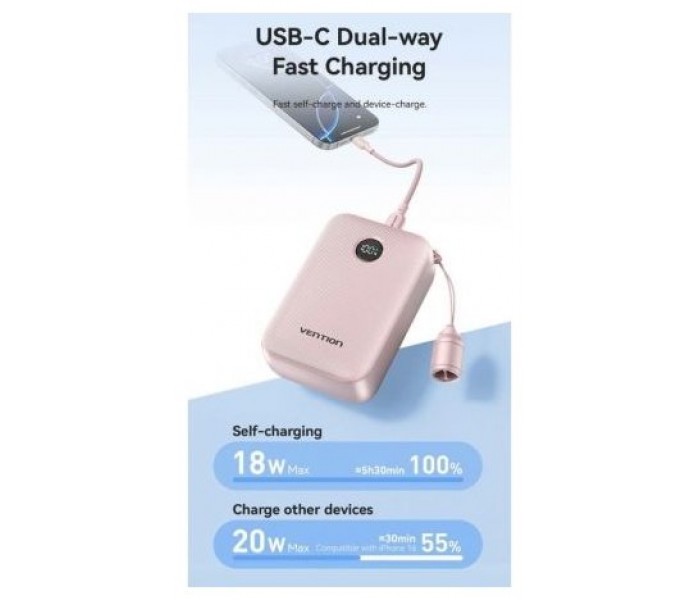 Powerbank 10000mAh Vention FHZP0/ 22.5W/ RosaPowerbank Vention 10000 mAh USB-C + Lightning + USB-A 22,5WAprobado por la aerolíneaSolución todo en unoCompacto y portátilDiseño de linternaLa batería externa Vention combina a la perfección tecnología moderna, funcionalidad y estética. Diseñada para qui..