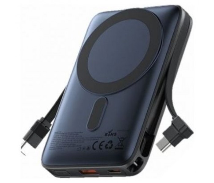 Batería externa magnética de 10,000 mAh (USB-C + USB-C/USB-A/Inalámbrico) con cable incorporado y soporte. Potencia de salida: 22.5 W Pantalla LED blanca Material: ABS con recubrimiento UV Soporte de aleación de aluminio