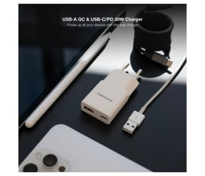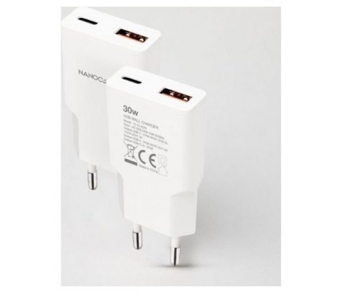 - 1 x Cargador USB-C/PD 30W + USB-A/QC 30W, Blanco