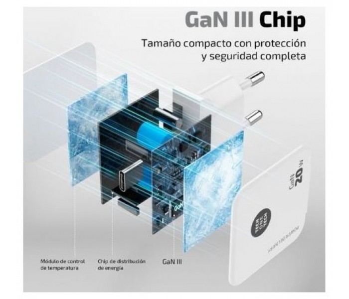 Cargador ultrarrápido con tecnología GaN Power Delivery 3.0 (PD) 20W, color blanco. Carga hasta un 400% más rápido que un cargador estándar de 5W. Compatible con dispositivos anteriores. Conector tipo USB-C de 3A. Este cargador permite cargar dispositivos como tabletas, móviles, consolas, baterías, auriculares, etc.
