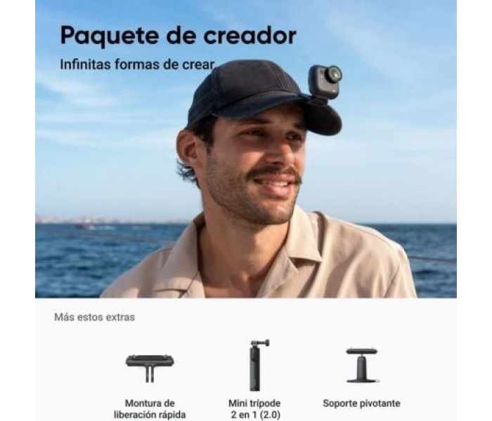 El paquete creador incluye: 1x GO Ultra, 1x Protector de Lentes (preinstalado en la lente por defecto), 1x cordón de seguridad de liberación rápida, 1x Easy Clip magnético, 1x colgante magnético, 1x montura de liberación rápida, 1x mini trípode 2 en 1 2.0, 1x soporte pivotante