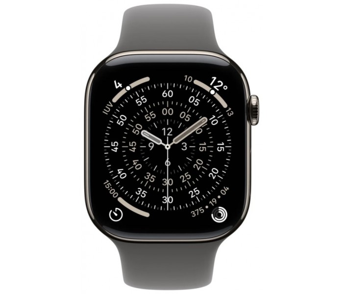 - Tamaño y peso: Alto: 46 mm, Ancho: 39 mm, Grosor: 9,7 mm, 416 x 496 píxeles, Superficie de pantalla de 1.220 mm², Peso (aluminio, GPS): 37,8 g, Peso (aluminio, GPS + Cellular): 36,9 g, Peso (titanio): 43,1 g, Para muñecas de 140 a 245 mm