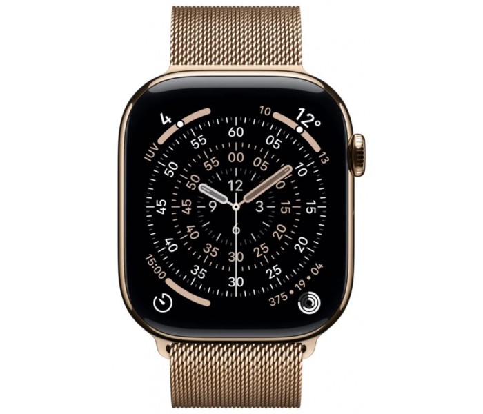 - Tamaño y peso: Alto: 46 mm, Ancho: 39 mm, Grosor: 9,7 mm, 416 x 496 píxeles, Superficie de pantalla de 1.220 mm², Peso (aluminio, GPS): 37,8 g, Peso (aluminio, GPS + Cellular): 36,9 g, Peso (titanio): 43,1 g, Para muñecas de 140 a 245 mm