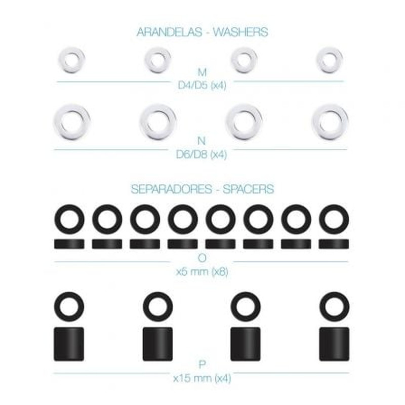 - 4 unidades de M8x12, 4 unidades de M8x20, 4 unidades de M8x35 y 4 unidades de M8x50
