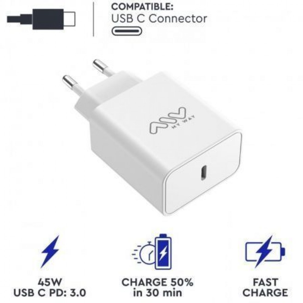 ¡No pierdas más tiempo buscando un cargador de pared que se adapte a tus necesidades! El cargador de pared Tipo C PD 45W blanco de MyWay es la elección perfecta para cualquier usuario que necesite una carga rápida y eficiente para sus dispositivos Tipo C. ¡Haz tu pedido hoy mismo y disfruta de la mejor calidad y rendimiento!