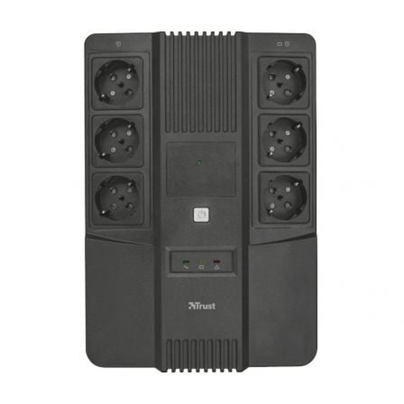 - 3 tomas de corriente para batería y protegidas contra sobretensiones y 3 tomas de corriente de pared protegidas contra sobretensiones para conectar el ordenador, periféricos informáticos, equipos de redes, TV de pantalla plana, productos de domótica o sistemas de alarma