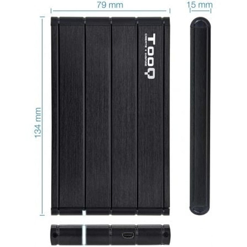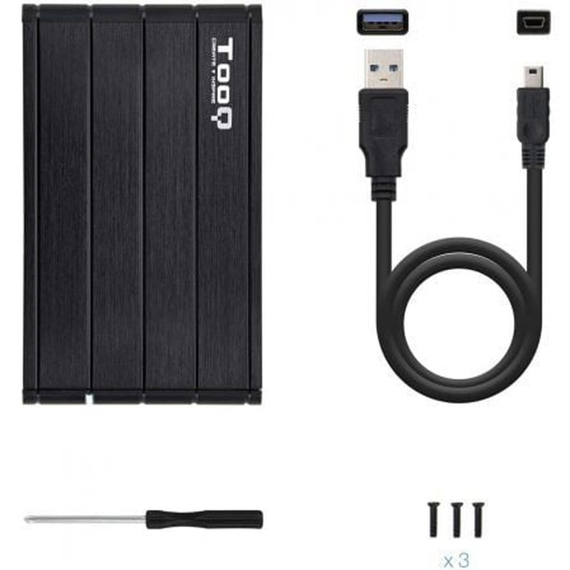 Caja Externa para Disco Duro de 2.5" TooQ TQE-2524B/ USB 3.1 Conexión USB 3.0/3.1 Gen 1 con velocidad de transferencia de hasta 5 Gbps Compatible con discos de 2.5" de hasta 9,5 mm de alto 4 TB de capacidad máxima SATA I, II y III Tipos de archivos soportados: FAT32/NTFS/APFS/eXT4/HFS..