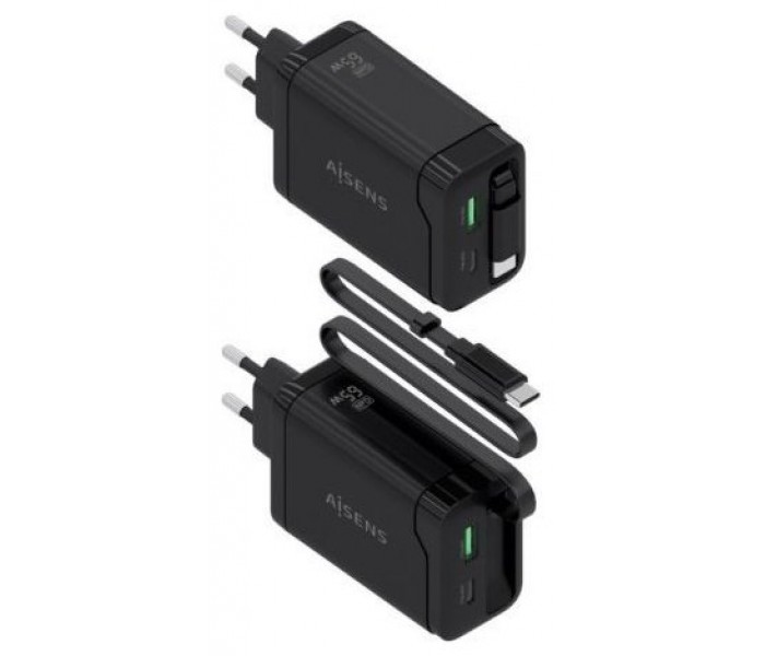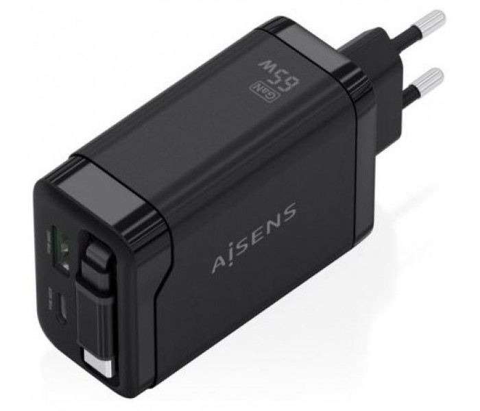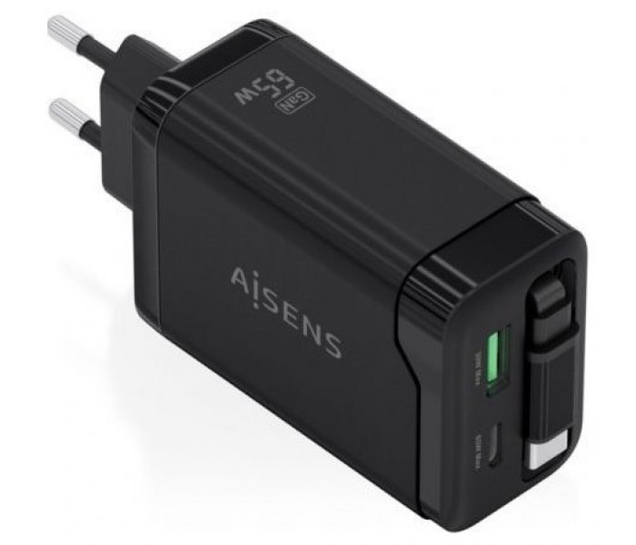 ASCH-65W3P071-BK – Cargador GaN 65W, 1xUSB-C Cable Retráctil, 1xUSB-C PD3.0, 1xUSB-A QC3.0, Negro