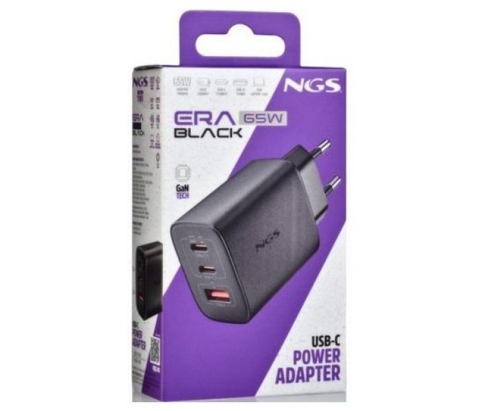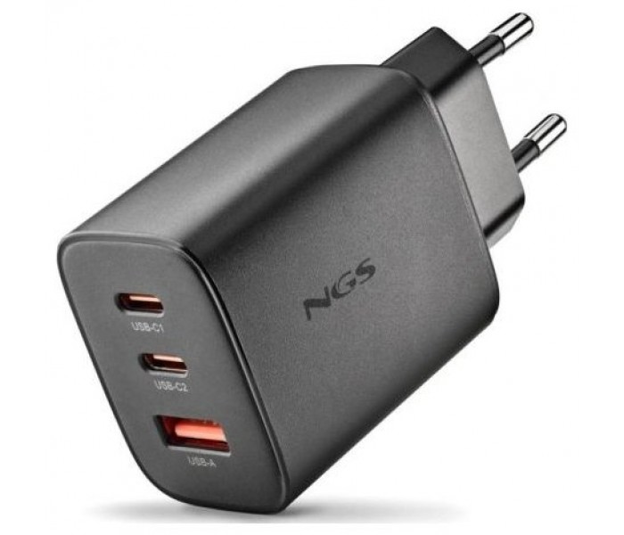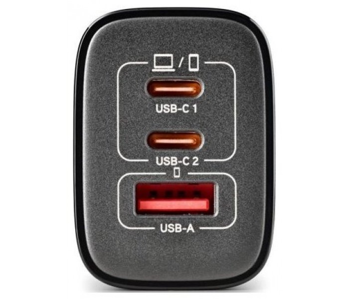- Cargador GaN de pared con 2 salidas USB-C (PD & PPS) y una salida USB-A QC 3.0 de 65W de potencia máxima para cargar dispositivos de manera rápida y eficiente.