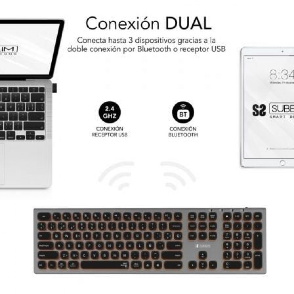 - El Teclado Inalámbrico SUBBLIM Master soporta 3 dispositivos mediante dos canales con tecnología inalámbrica Bluetooth 5.2 y uno a través de un receptor USB RF 2.4G.