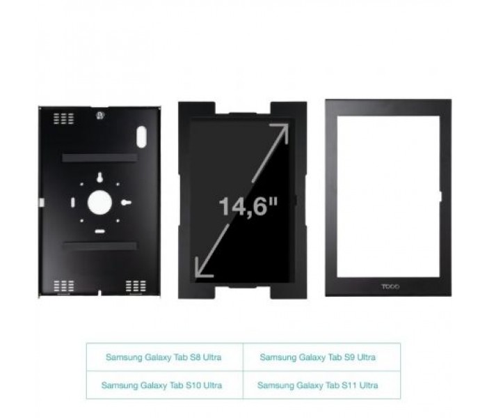 Marco antirrobo con cerradura a llave para tablets de 14,6”Tablets compatibles: Samsung Galaxy Tab S8 Ultra/ S9 Ultra/ S10 Ultra / S11 UltraCompatible con VESA 75x75Ranuras para un fácil acceso a todos los botones, cámara y cable de alimentación de la Tablet.Permite instalación directa en pared o montaje sobre soporte con VESA 75x75, como los modelos TQATC2601-B y TQATWM3401-B, entre otros.Almohadillas de protección para evitar arañazos y mejorar la sujeción.Incluye cerradura y llaves (2 uds.).Peso máximo soportado: 1 KgColor: NegroMaterial: fabricado en acero de alta calidadMedidas del producto: 250x392x22 mmPeso Neto: 1,660 Kg Peso bruto: 1,840 KgMedidas embalaje: 255x400x27 mm