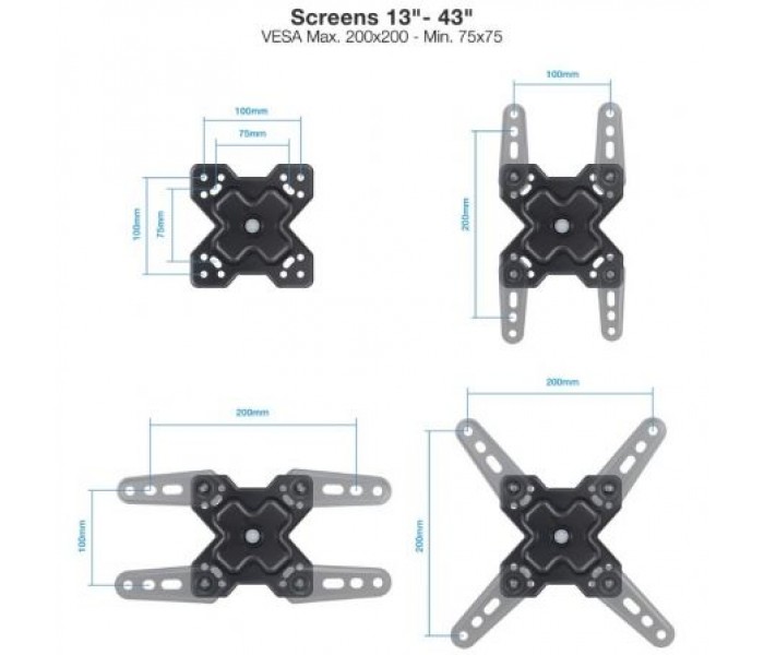 Soporte de Pared Giratorio/ Inclinable/ Nivelable TooQ LP7843TN-B para TV de 32-55"/ hasta 35kg Especificaciones Pantallas soportadas: 32"- 55" Compatible con VESA: 100x100, 150x100, 100x150, 100x200, 200x100, 150x150, 200x200, 300x200, 400x200, 300x300, 400x300, 400x400 Peso máximo sopo..